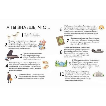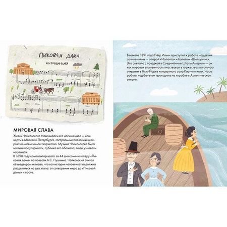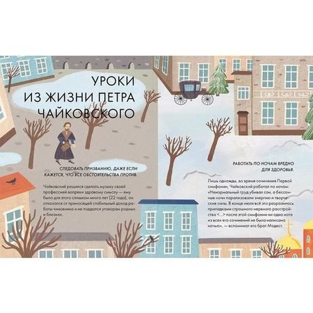 Чайковский жил более 150 лет назад, но его музыка интересна и сегодня, ее слушают и узнают люди разных стран, возрастов и культур. Сочинения Чайковского звучат не только со сцен серьезных концертных залов и оперных театров — ее можно услышать в художественных фильмах, в рекламе, в компьютерных играх. Всего Петр Ильич создал 440 музыкальных произведений: 11 опер, 3 балета, 7 симфоний, музыку для фортепиано, кантаты, сюиты, увертюры и множество других произведений.Эта краткая иллюстрированная биография расскажет о жизни великого композитора: как прошло его детство и почему он решил заниматься музыкой только став взрослым, как критики встретили его первые работы и какое свое произведение Петр Ильич считал шедевром. Вы узнаете о роли друзей в жизни Чайковского, его полезных привычках и увлечениях, помимо музыки. А еще вдохновитесь следовать мечте и призванию, несмотря ни на какие условности!Зачем читать:Узнать, как появились самые известные произведения Чайковского;Вдохновиться на творчество;Извлечь уроки из жизни великого композитора.Для детей от 6 лет.