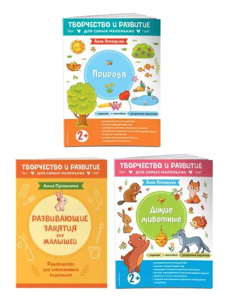 2 красочных альбома для практических занятий + руководство для родителей предназначены для творческих и развивающих занятий с малышом. Лепите, клейте, рисуйте, выполняйте задания на мышление и изучайте окружающий мир вместе с нами!