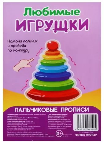 Серия "Пальчиковые прописи"это максимально полезное и увлекательное упражнение для малышей возраста 3+. Способствует развитию графомоторных навыков. Водочувствительный слой нанесен по контуру каждого рисунка, когда малыш проводит мокрым пальчиком, краски проступают. При этом ребенок не пачкается, а упражнение можно делать повторно после высыхания контура. 0