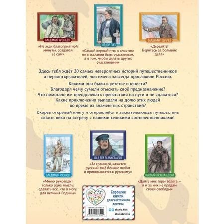 Эта книга патриотической серии «Великие люди великой страны» рассказывает о двадцати наших знаменитых соотечественниках — путешественниках и первооткрывателях, чьи имена навсегда останутся в истории России. Кто был капитаном первого русского корабля, совершившего кругосветное плавание? Кому посчастливилось обнаружить древний мёртвый город? Кого называют русским Колумбом ХХ века? Кто открыл Антарктиду?Захватывающие сюжеты в жанре нарративного нонфикшена, исторических «детективов» и «боевиков»! В каждом рассказе — вдохновляющая читателей на собственные свершения история успеха, невероятный пример силы воли и стойкости характера! Динамичные, запоминающиеся, современные, яркие иллюстрации созданы специально для этой книги!Издание предназначено для среднего школьного возраста, однако будет интересно и взрослым, а также станет неповторимым подарком по любому поводу для всех, кто любит Россию и гордится ею. Читайте всей семьёй и узнавайте всё самое интересное о великих людях нашей страны!